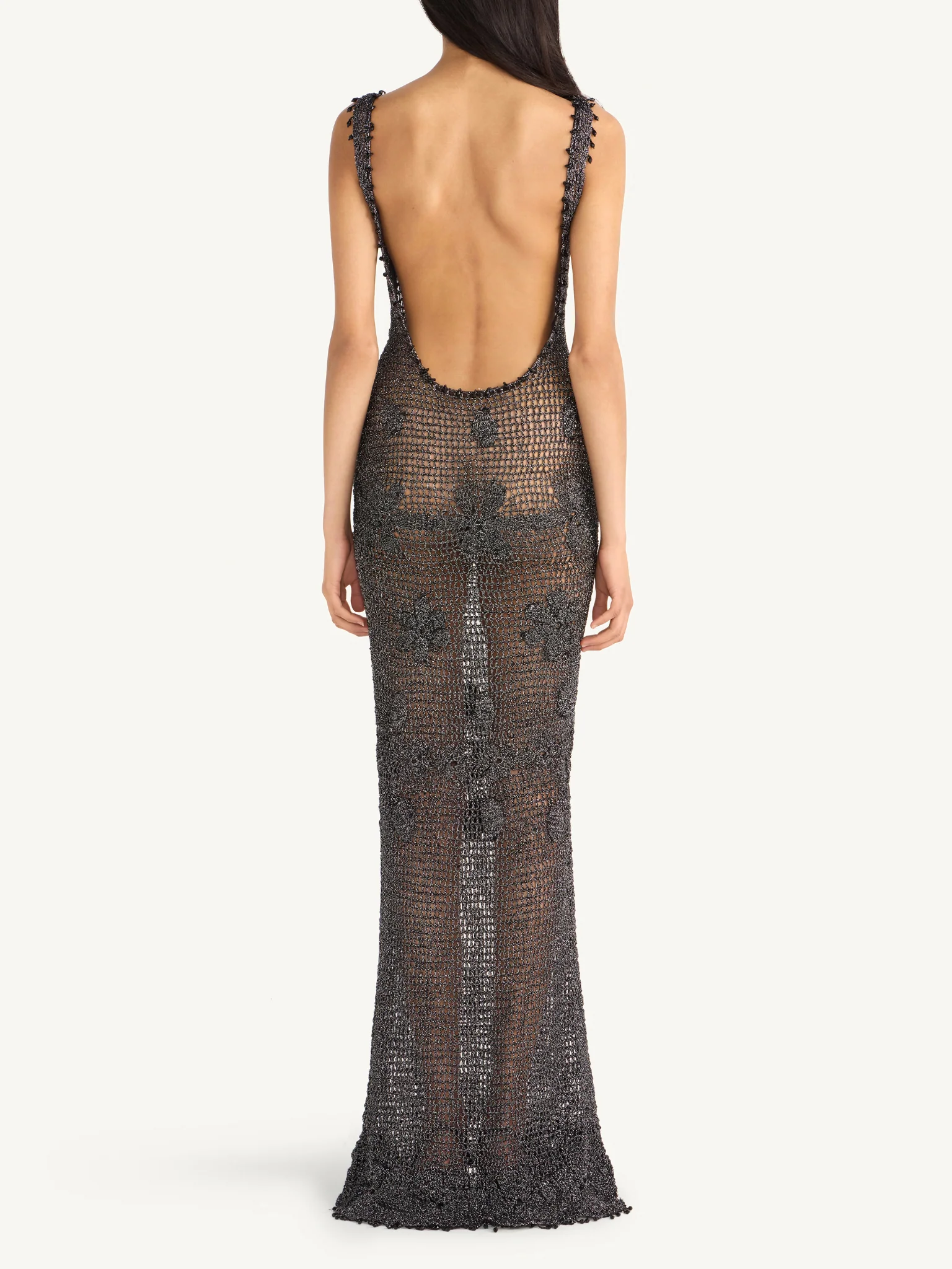 This form-fitting maxi drapes softly over the body, designed to move effortlessly with you. Delicate straps and a subtle scoop neckline frame the décolletage, while the daring low back adds an unexpected, sensual twist. The open hand-crochet construction creates a sheer, second-skin effect, and a straight hem with subtle beaded accents completes the look - balancing fluidity with refined structure for an effortlessly striking silhouette.