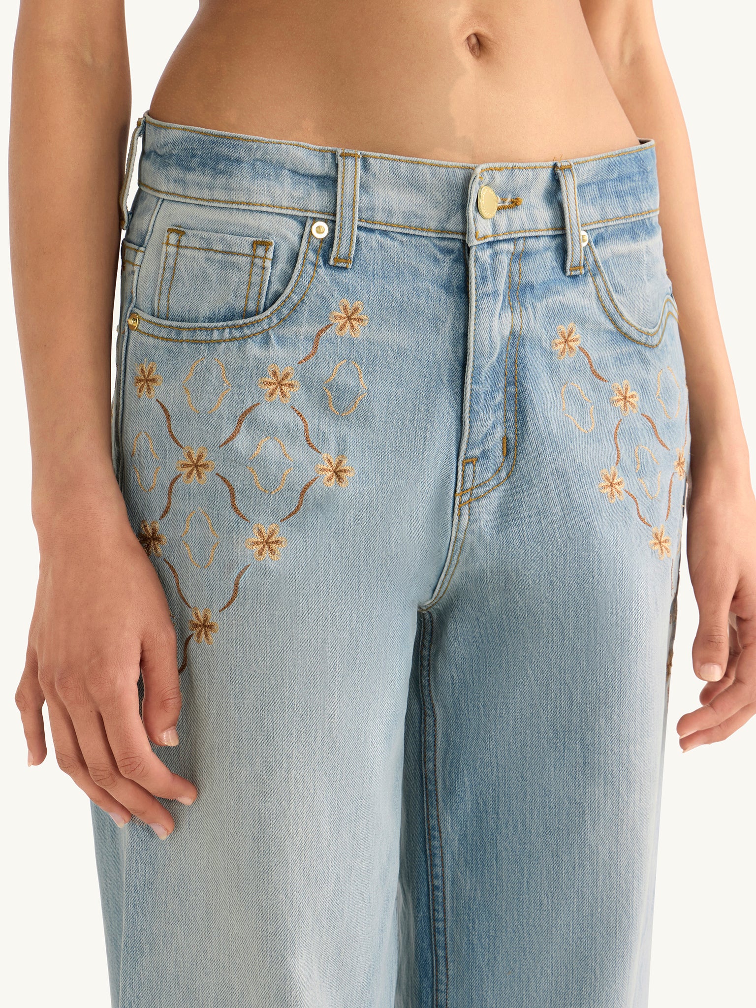 The Helena Embroidered Jean by ASTA RESORT in Light Blue. A straight, mid-rise jean made and washed in Los Angeles, California. Finished with embroideries and motifs central to the ASTA RESORT world, for a storied and distinctive finish.