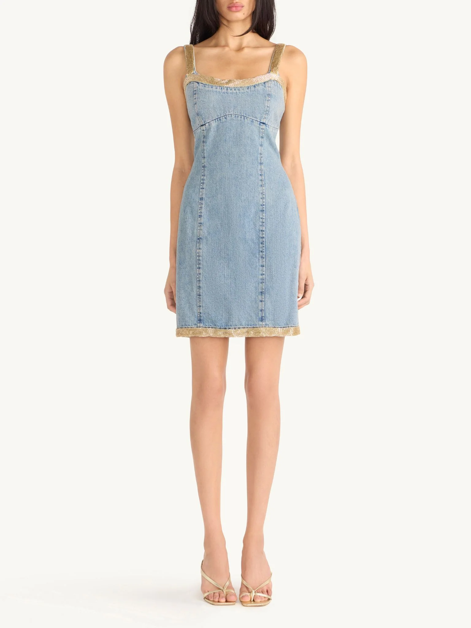 Tailored to sculpt the form, the Vera is a structured mini dress cut from soft light-wash denim. Framed with golden hand embroidery along the straps, neckline and hem, offering a touch of artisanal detail against the timeless appeal of denim.